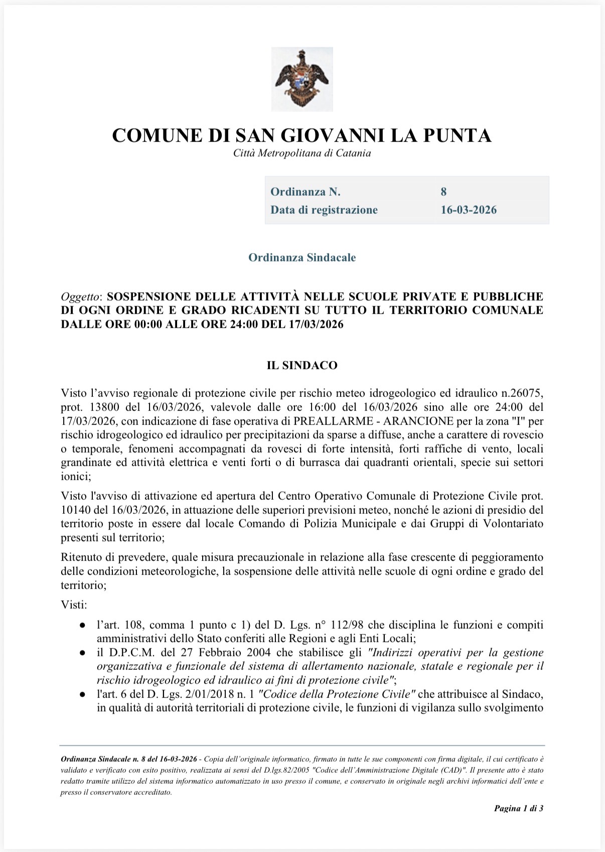 Anche per domani martedì 17 marzo a seguito dell’allerta meteo arancione, diramata dalla Protezione civile, saranno sospese le attività didattiche delle scuole del territorio di ogni ordine e grado.